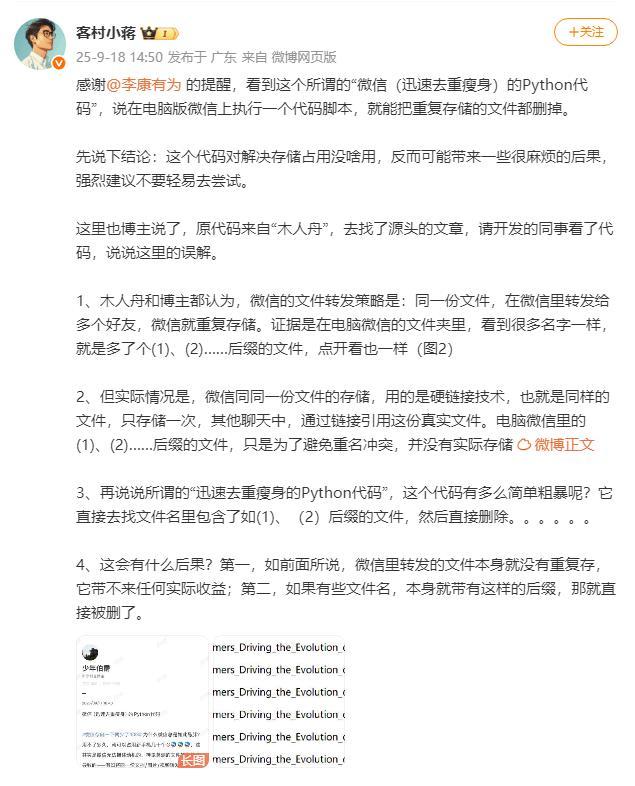近日,一段声称能通过Python代码清理微信重复文件、释放数十GB存储空间的网络分享引发热议,相关话题“微信存储一下就少了10G”一度登上社交媒体热搜。
